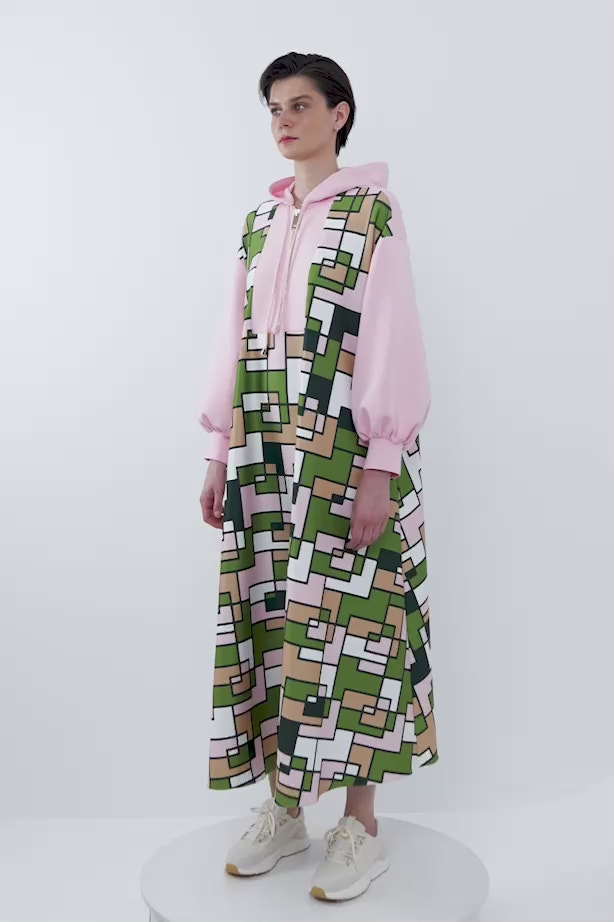 Fermuar Detaylı Kapüşonlu Özel Desen Scuba Maxi Elbise