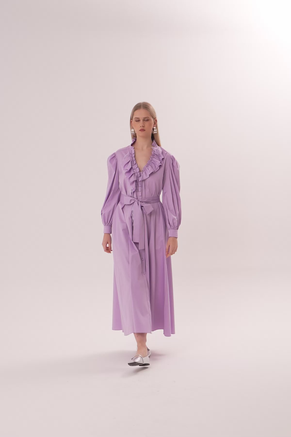 Fırfır Detaylı Belden Bağlamalı Maxi Astarlı Elbise