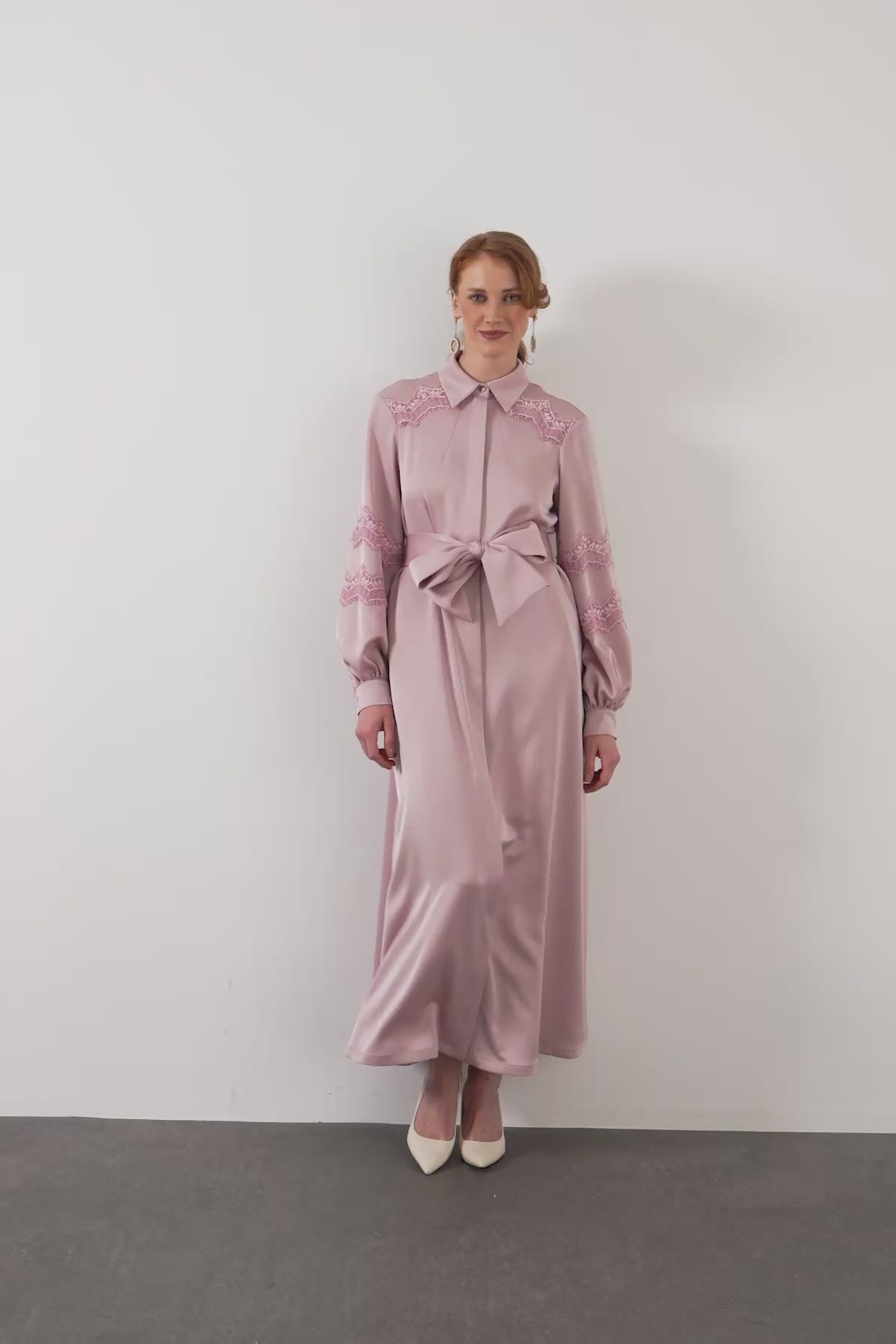 Gömlek Yaka Dantel Detaylı Seyyar Kuşaklı Uzun Elbise
