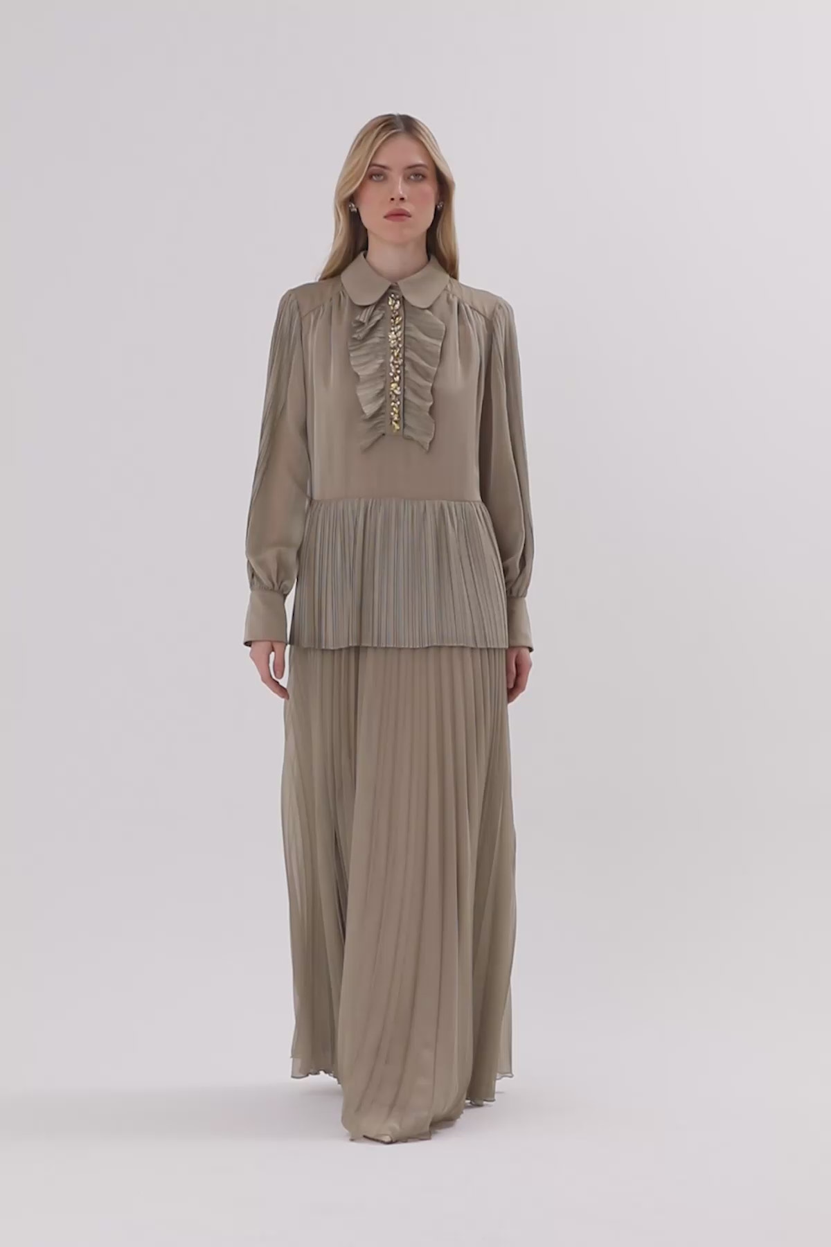 Gömlek Yakalı Pliseli Uzun Elbise
