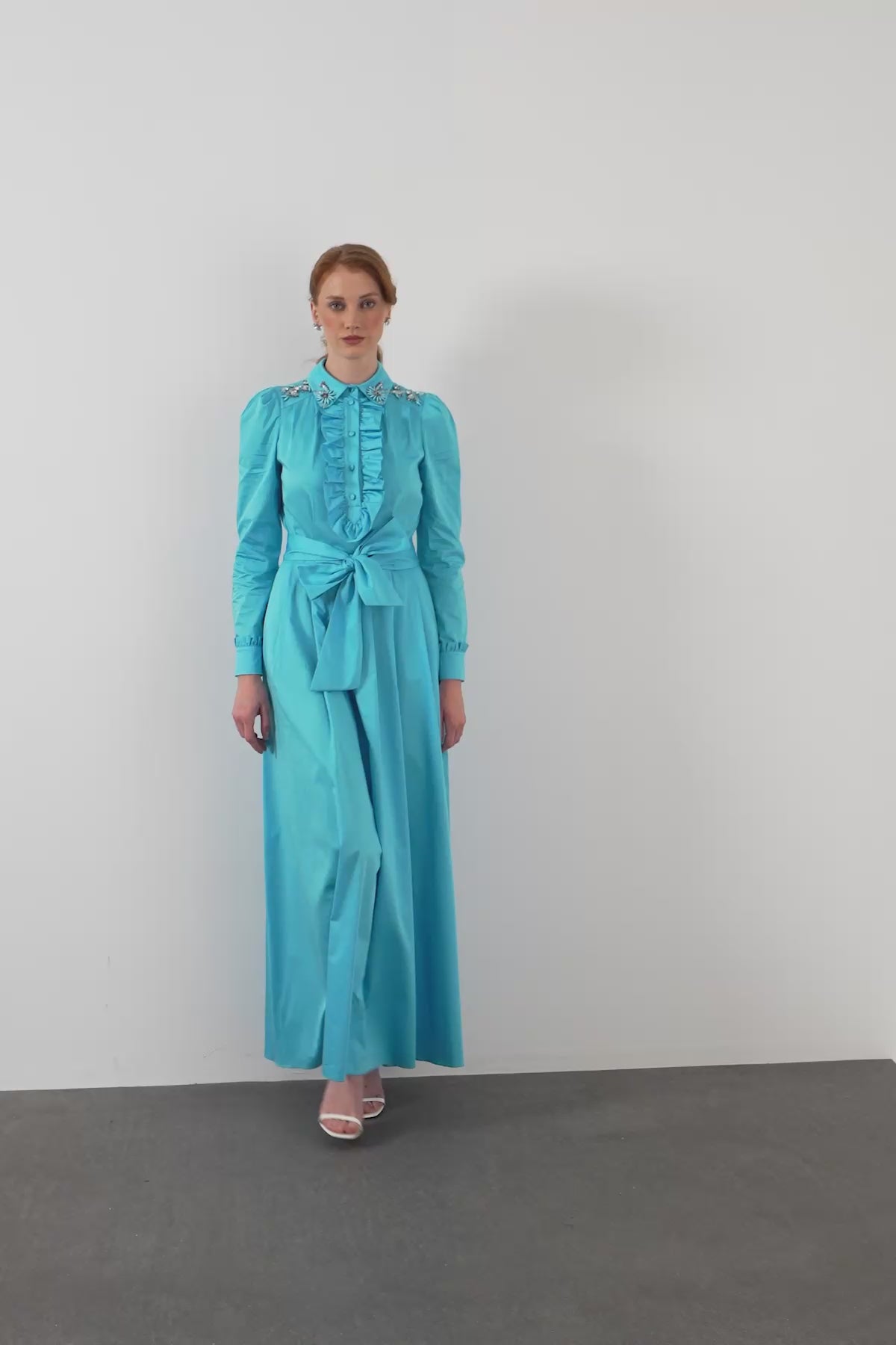 Gömlek Yakalı Seyyar Kuşaklı Turkuaz Uzun Elbise