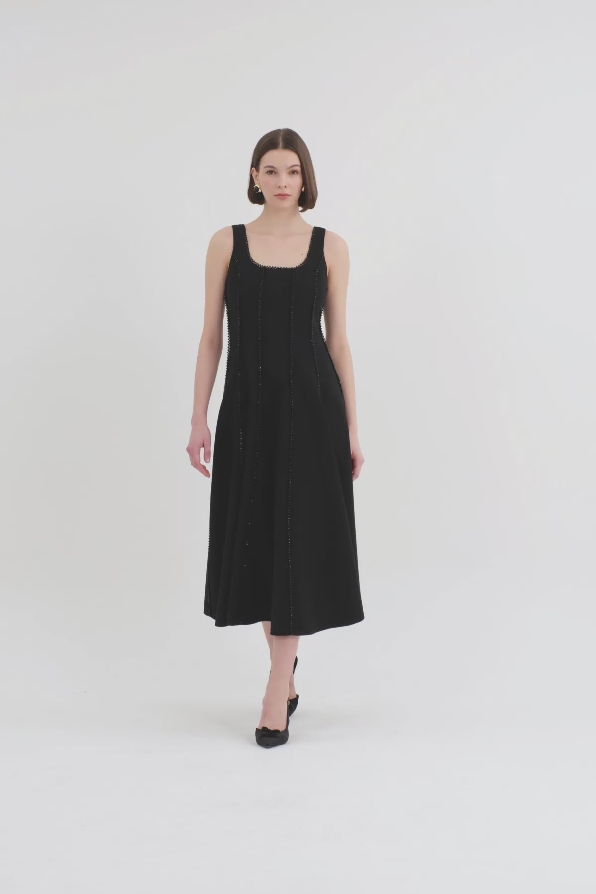 İşleme Şerit Detaylı Kloş Siyah Elbise
