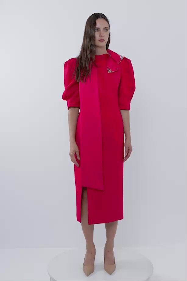 İşleme Detay Önü Yırtmaçlı Karpuz Kollu Midi Boy Elbise