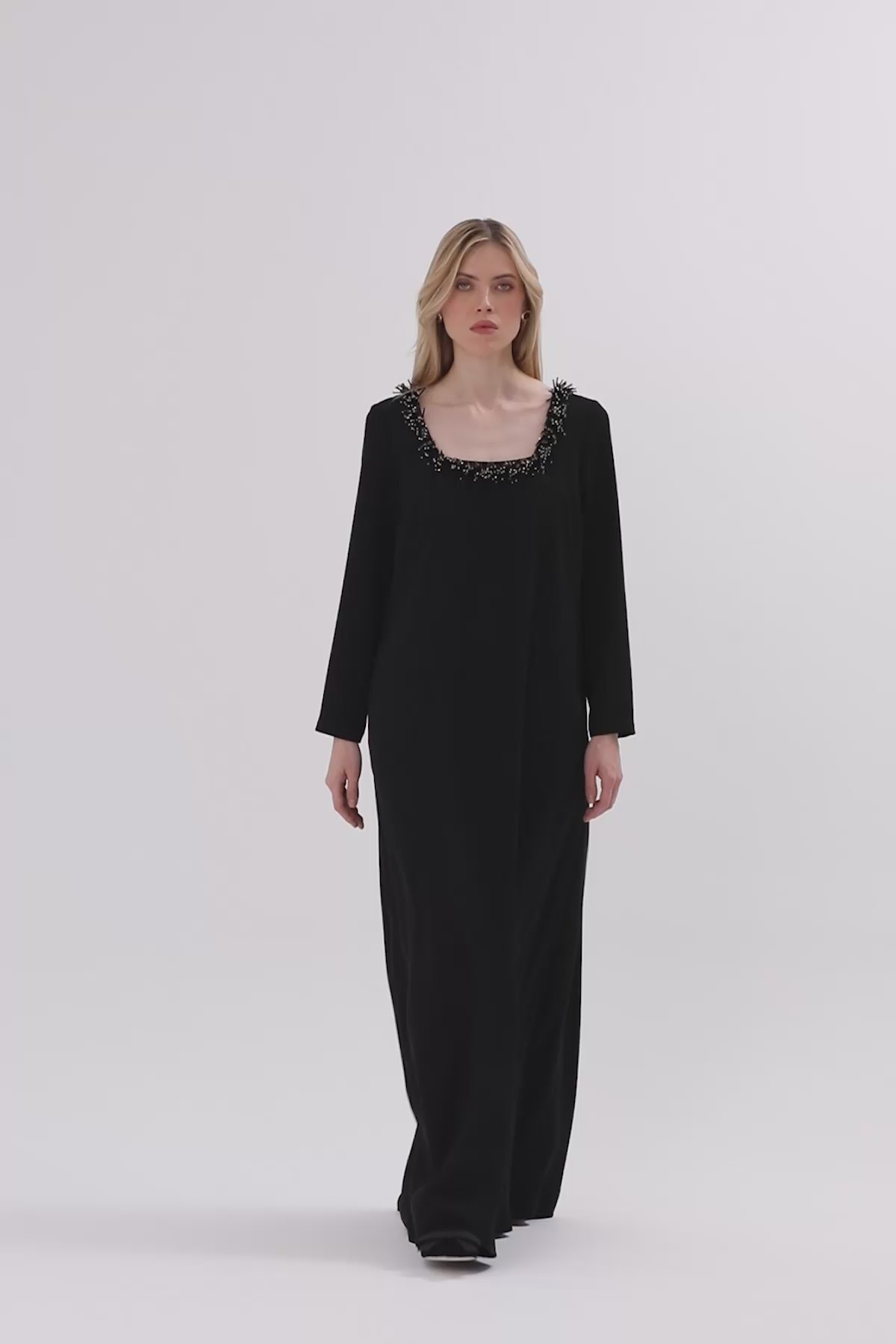 Kare Yaka İşlemeli Uzun Elbise