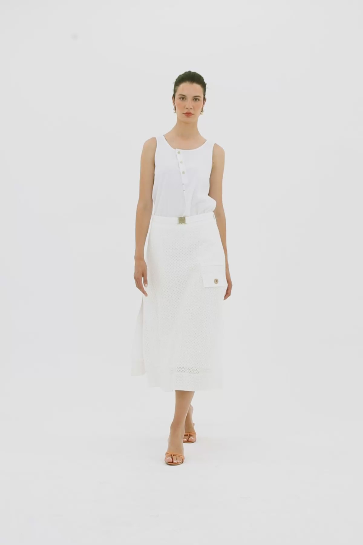 Kemerli Yanlardan Yırtmaçlı Ekru Midi Etek
