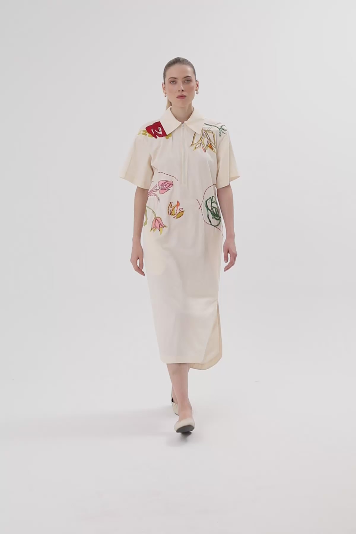 Kısa Kollu Nakışlı Midi Elbise