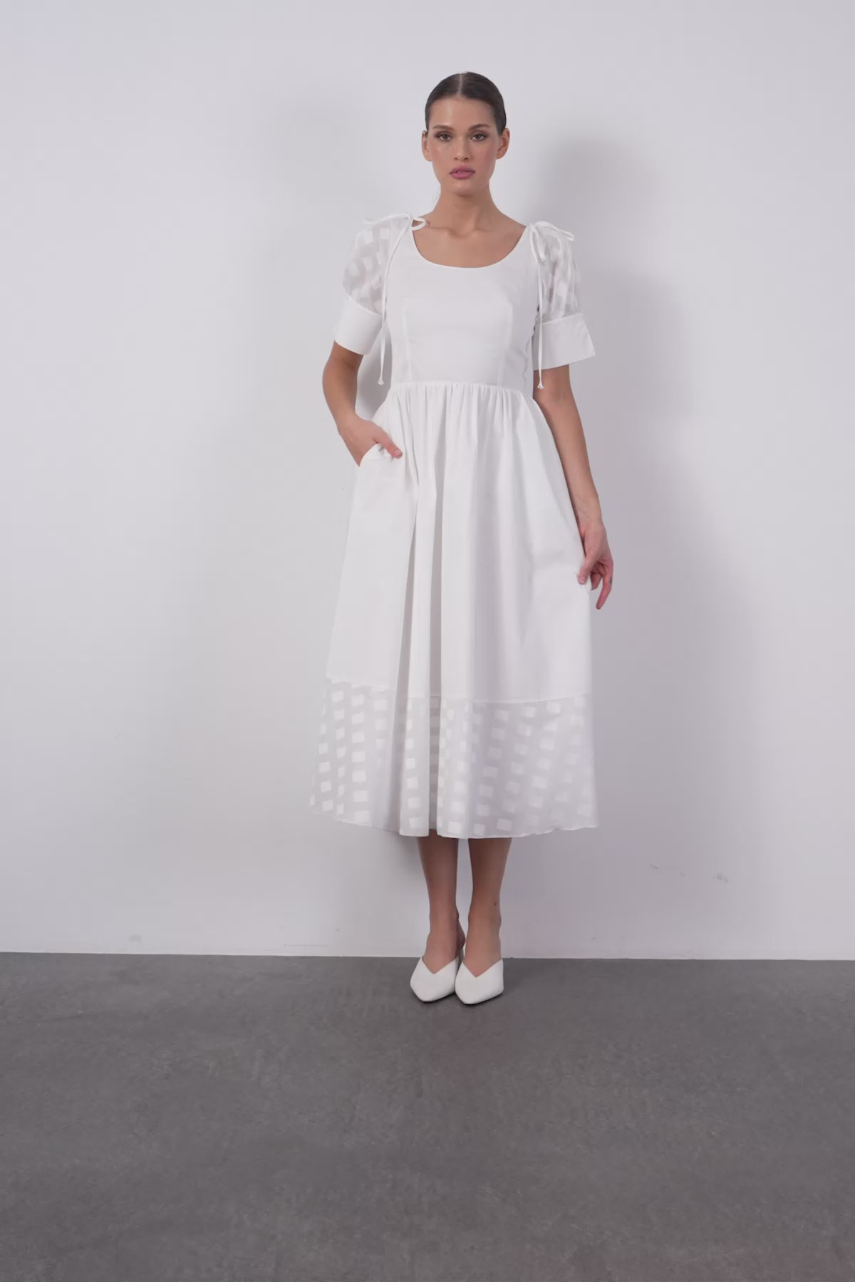 Kol Detaylı Bağucu İşlemeli Midi Boy Elbise