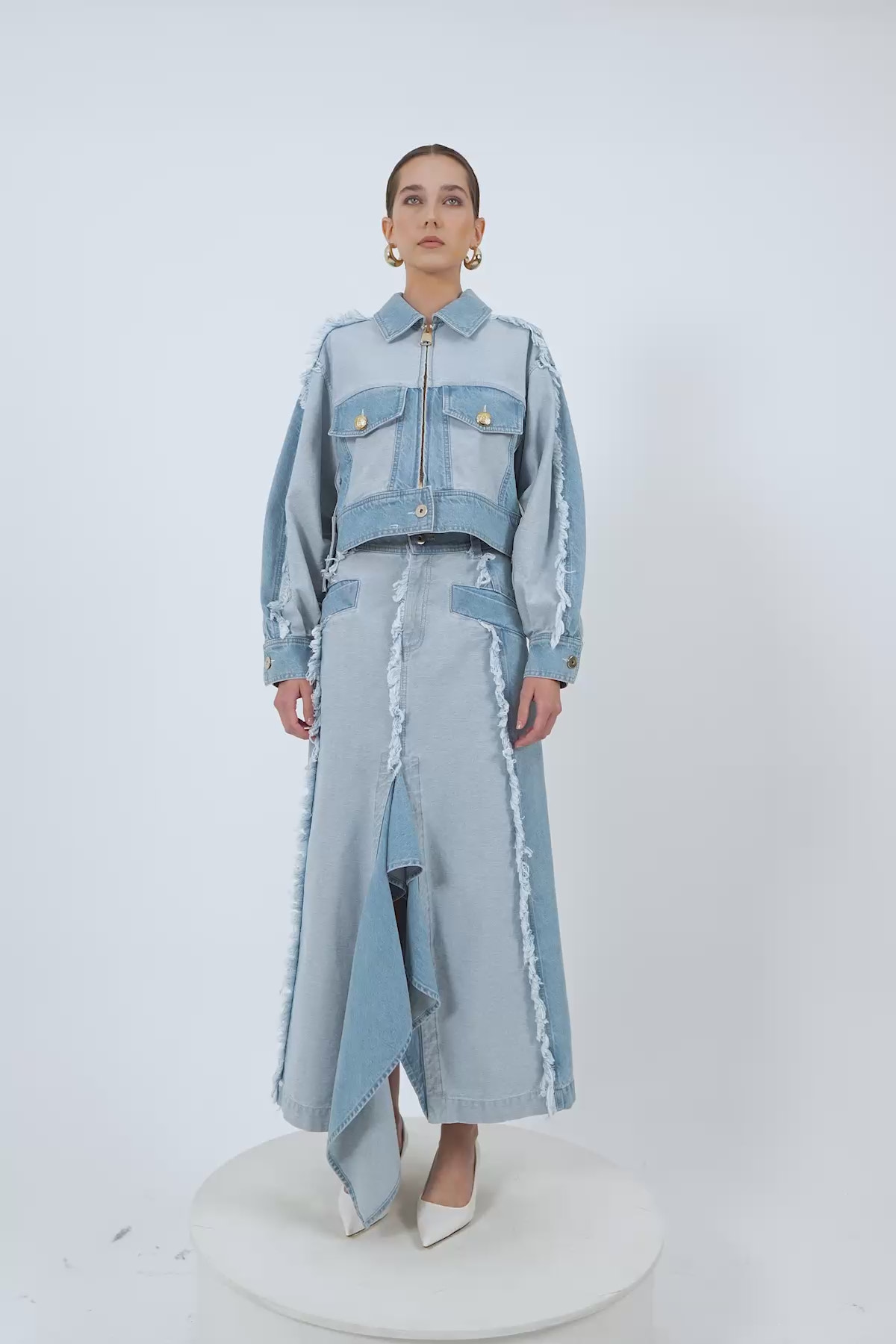 Kol Üstü Püskül Detaylı İki Renkli Jean Ceket