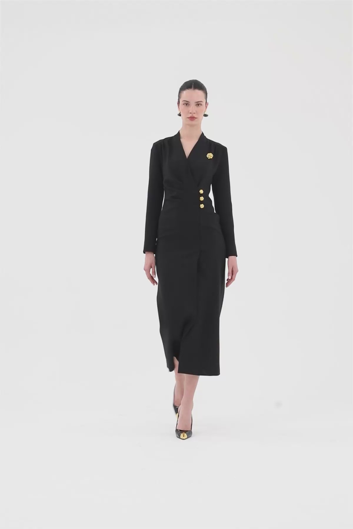 Kruvaze Kapamalı Yırtmaçlı Midi Elbise