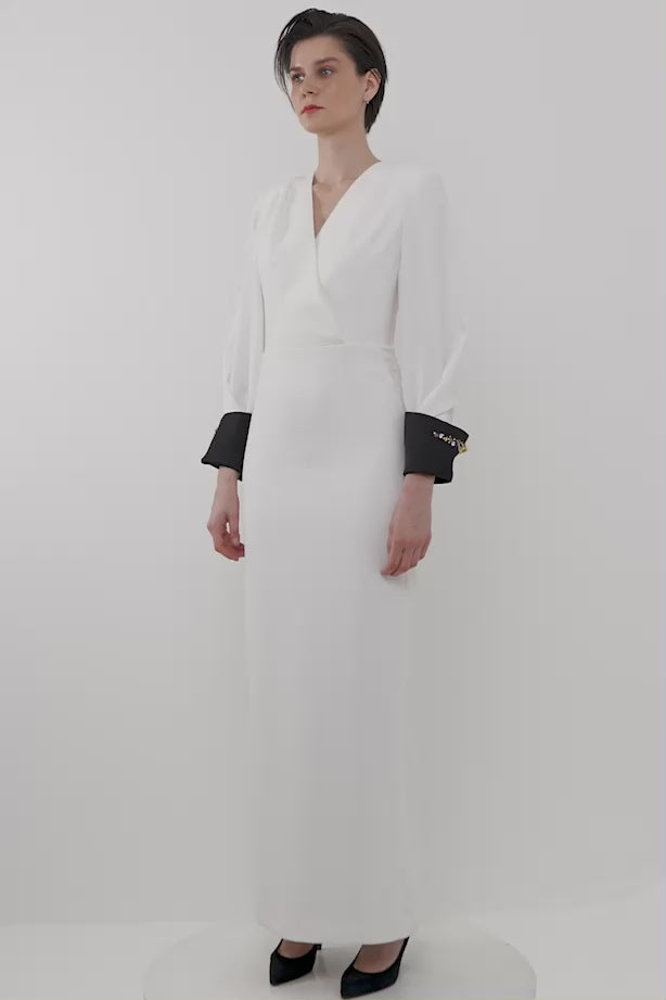 Manşeti İşleme Detaylı V Yaka Arkası Yırtmaçlı Uzun Elbise