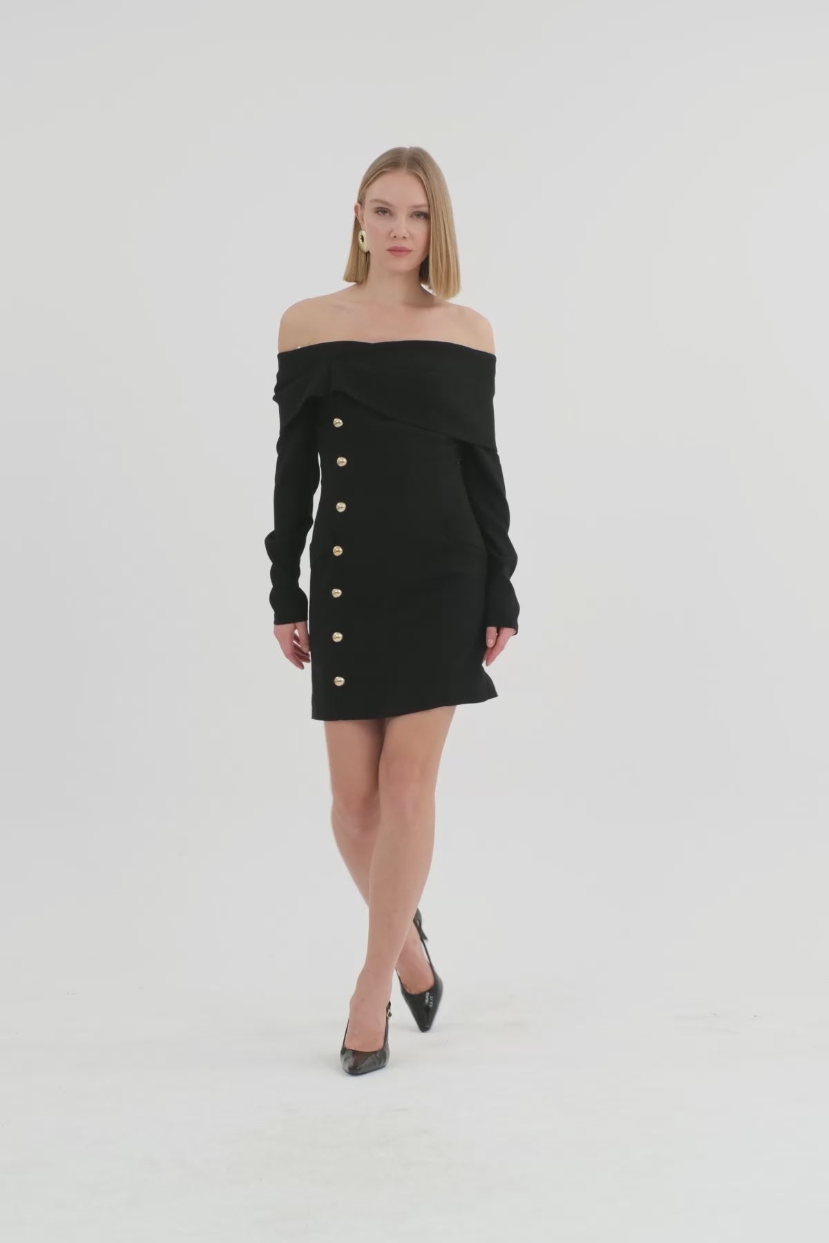 Metal Düğme Detaylı Straplez Siyah Kısa Elbise