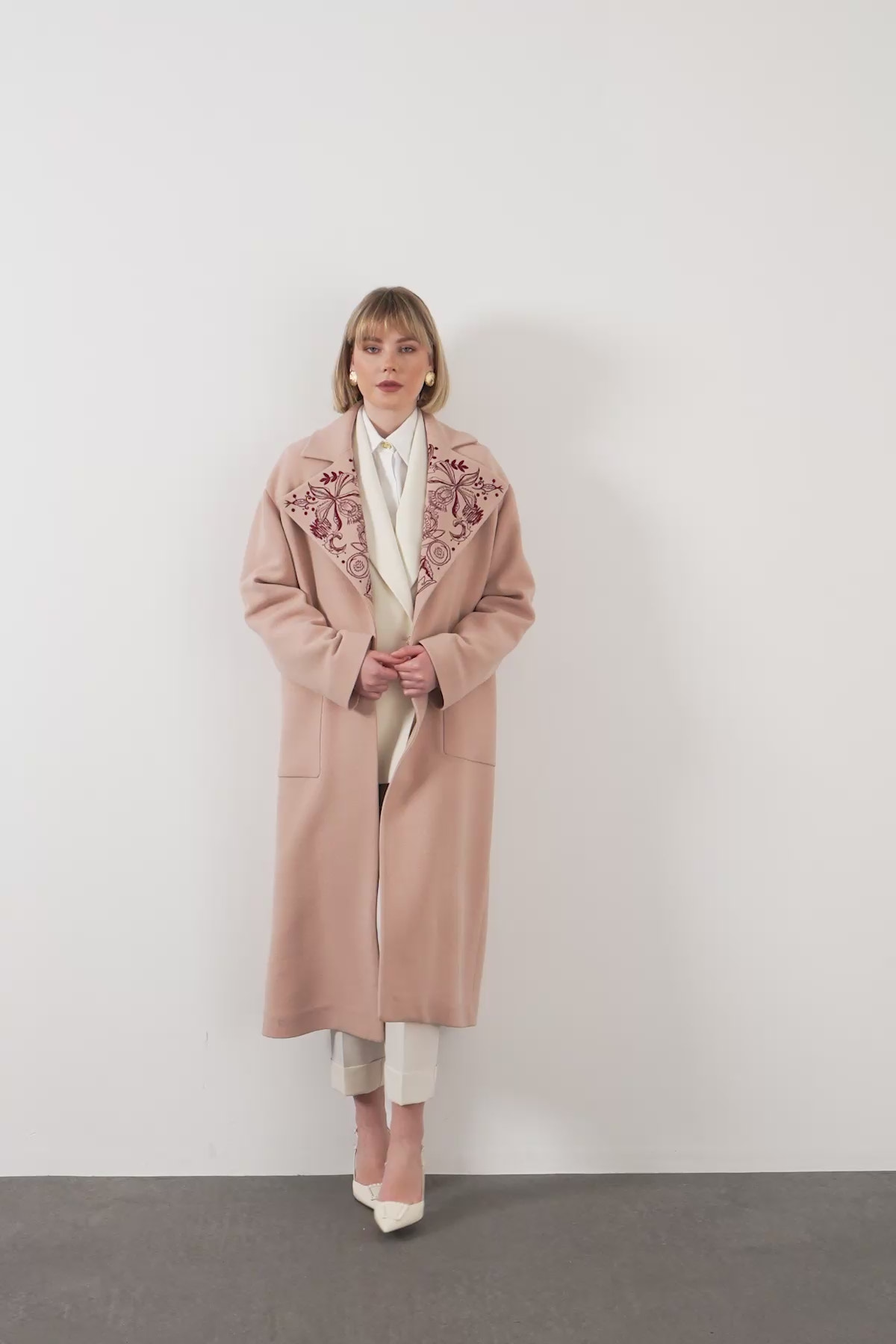 Nakış Detaylı Midi Boy Pudra Kaşe Kaban