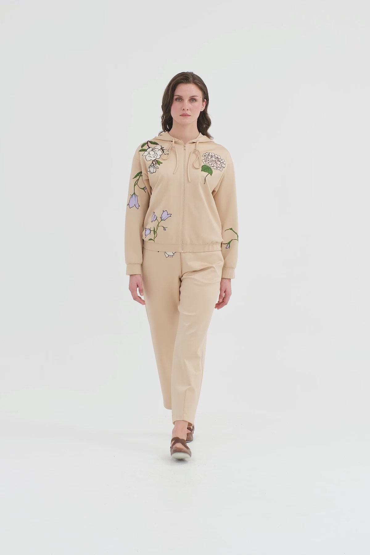 Nakışlı Kordonlu Bej Eşofman Üstü