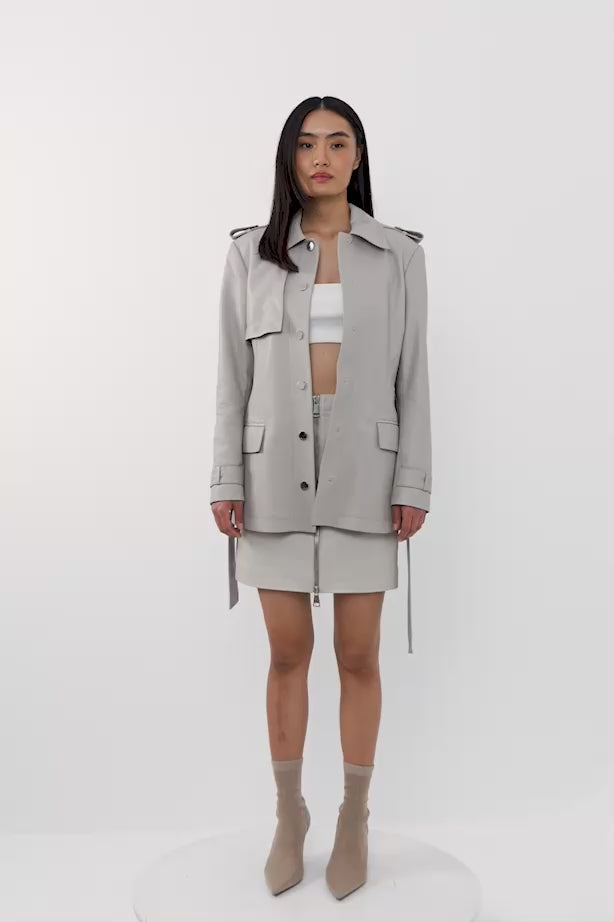Omuz Apolet Detaylı Kuşaklı Yırtmaçlı Deri Ceket