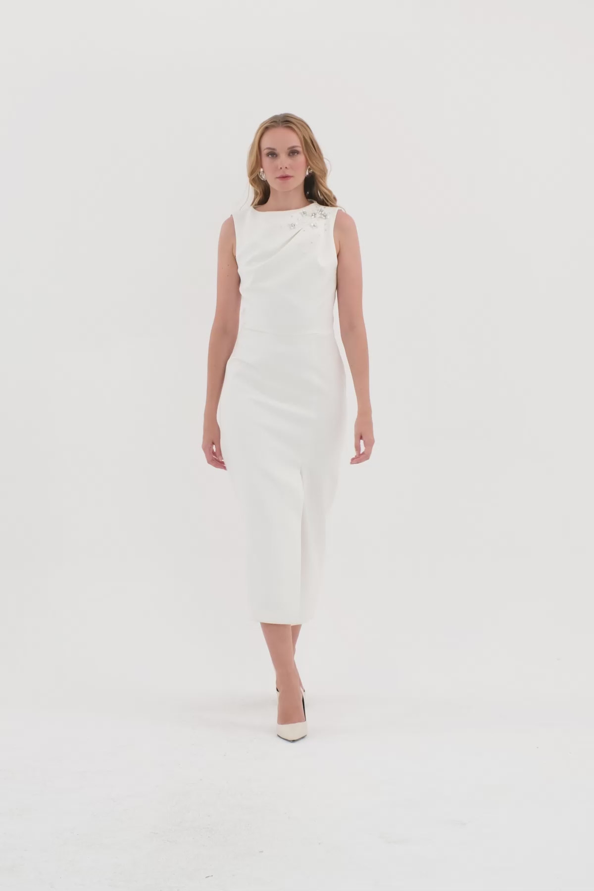 Omuzda Drepe Detaylı Yırtmaçlı Midi Elbise