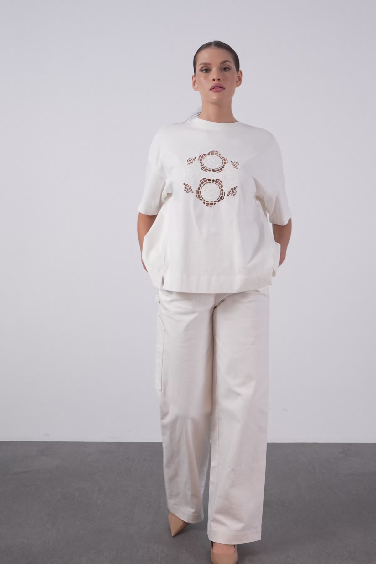 Ön Beden Delikli Nakış Detaylı Bisiklet Yaka Tişört