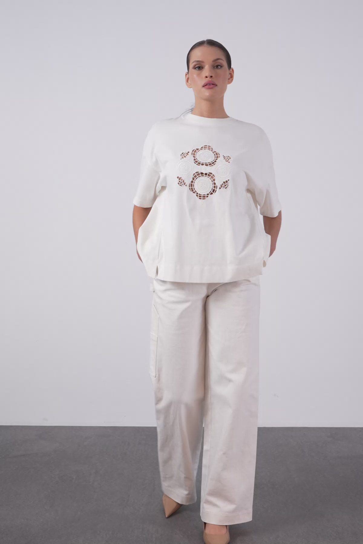 Ön Beden Delikli Nakış Detaylı Bisiklet Yaka T-shirt