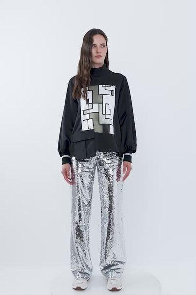 Ön Özel Desen Triko Bantlı Dik Yaka Bluz