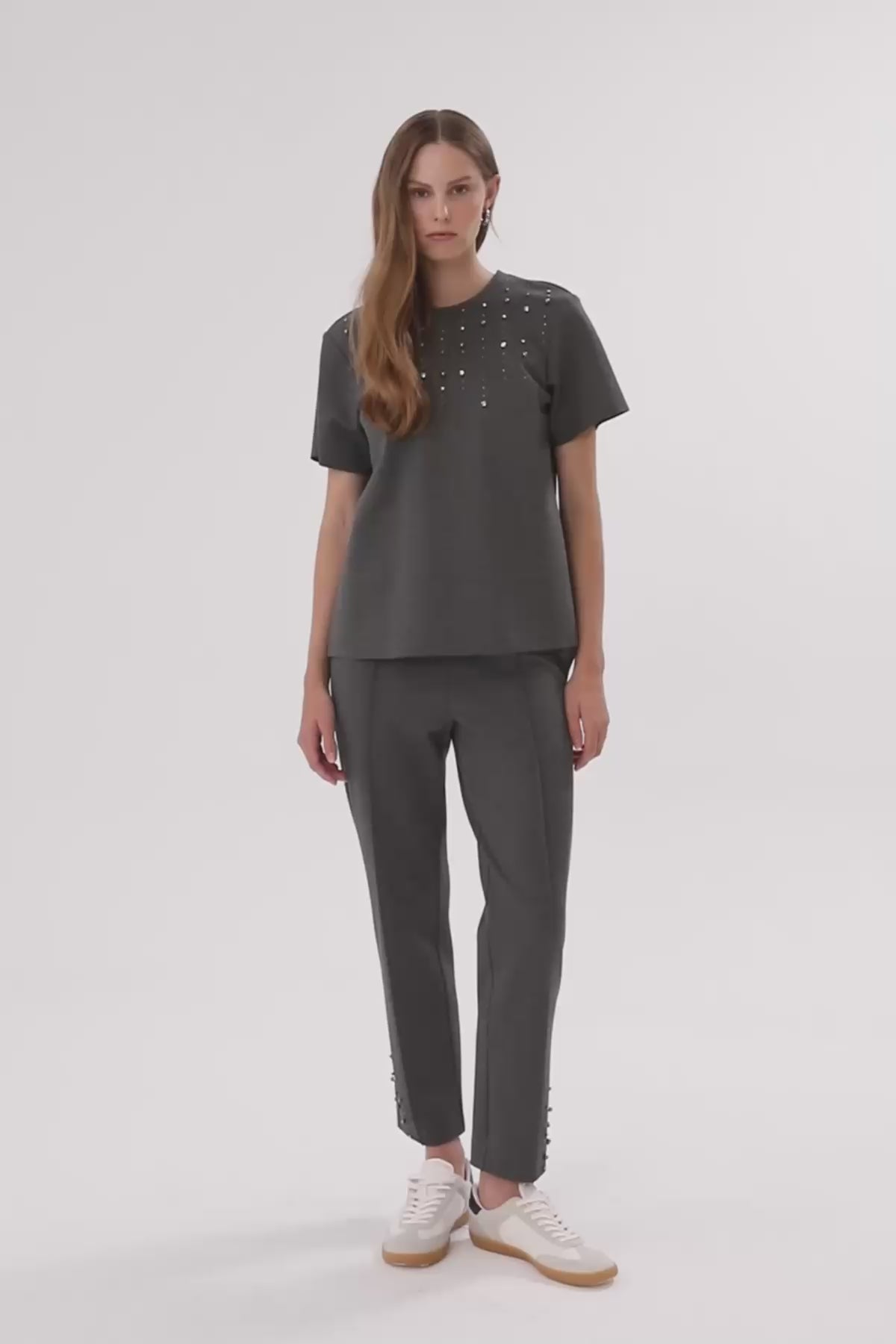 Önü Boncuk İşlemeli Kısa Kollu Tshirt