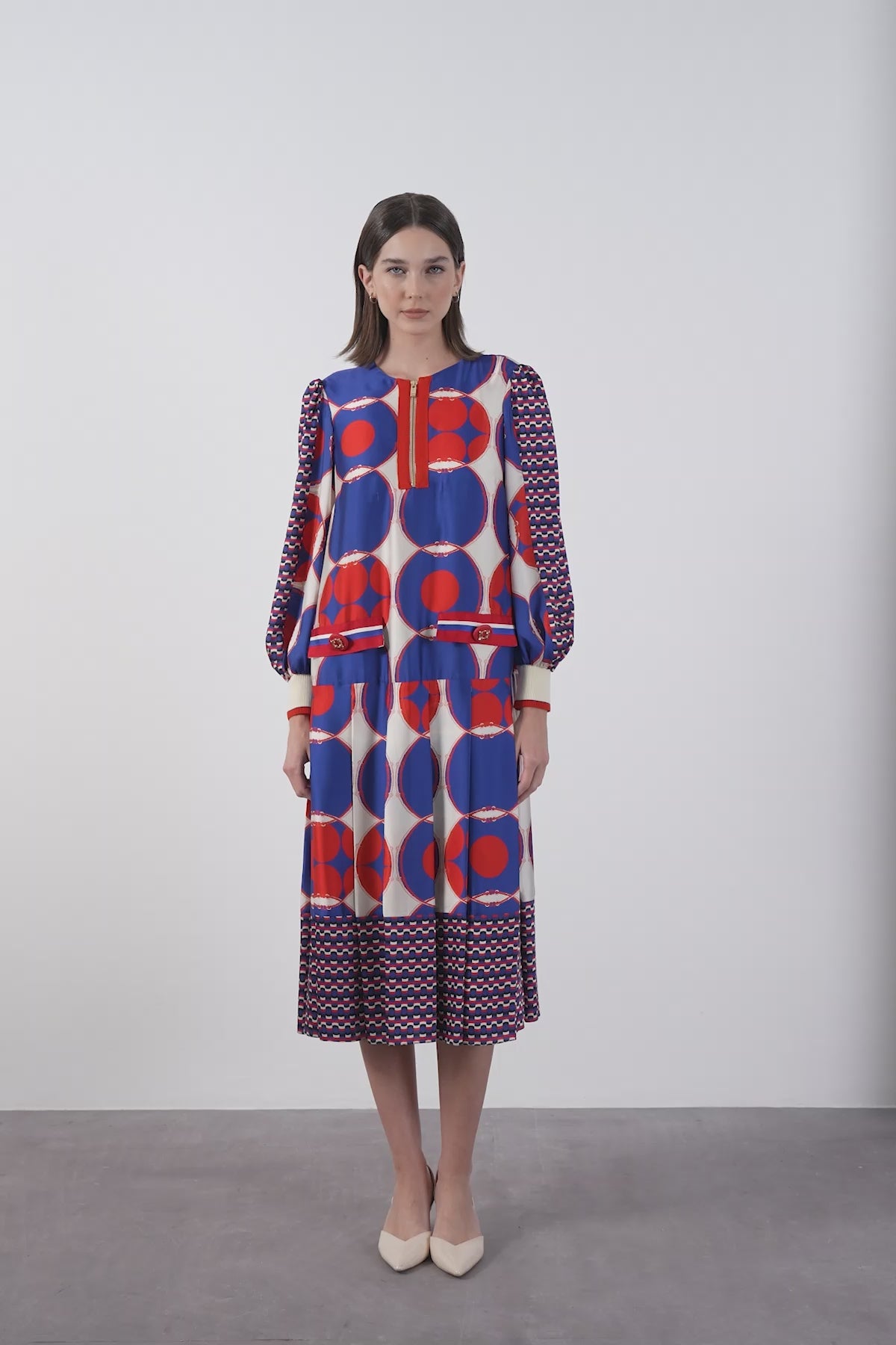 Önü Fermuar Detaylı Desenli Uzun Elbise