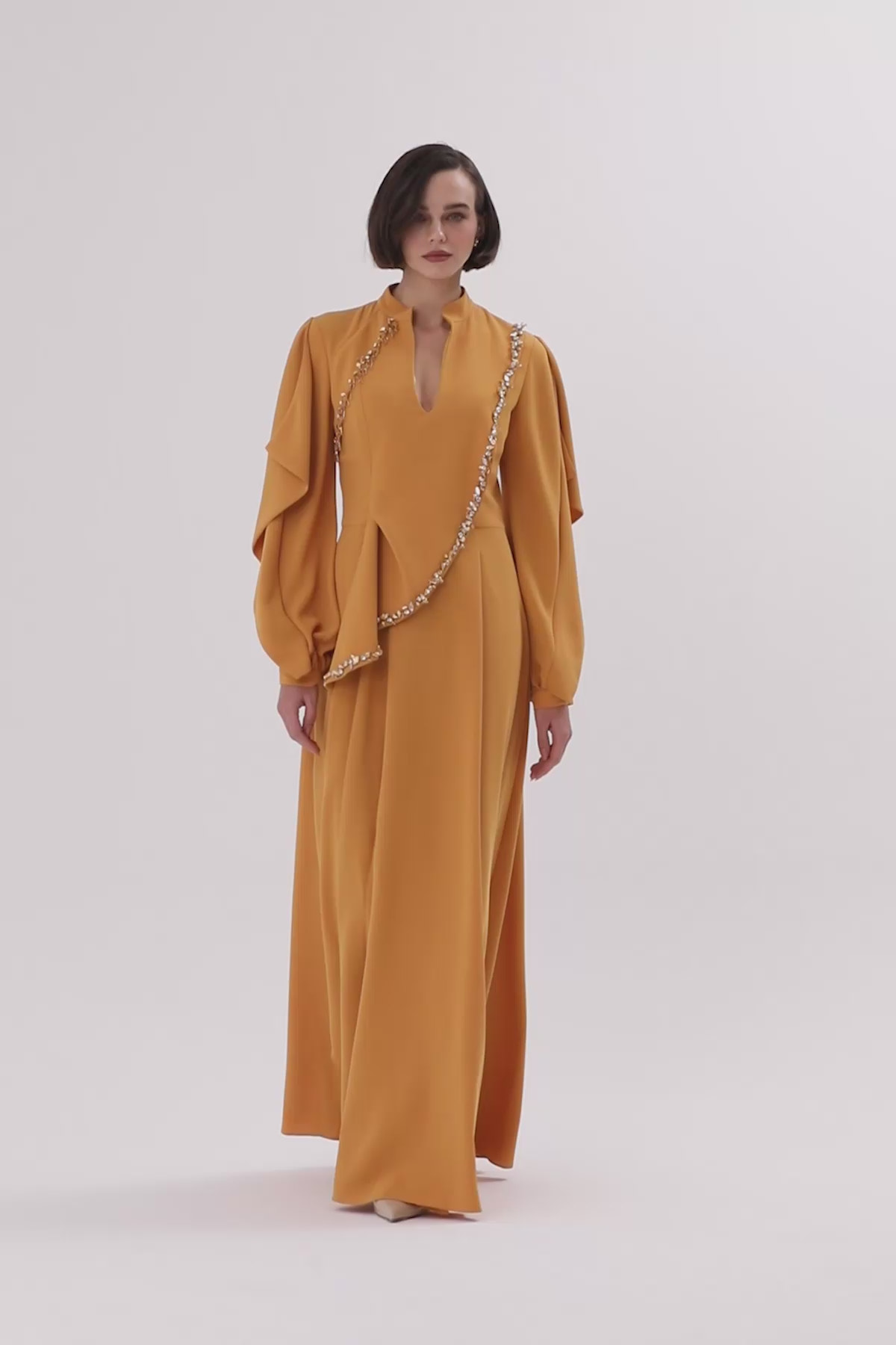 Önü Yırtmaçlı İşlemeli Uzun Elbise