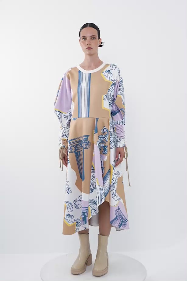 Özel Desenli Kolu Büzülebilir Midi Elbise