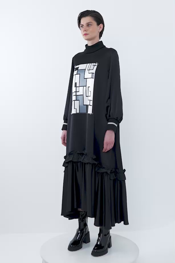 Özel Pano Desen Detaylı Triko Manşetli Dik Yaka A Form Maxi Elbise
