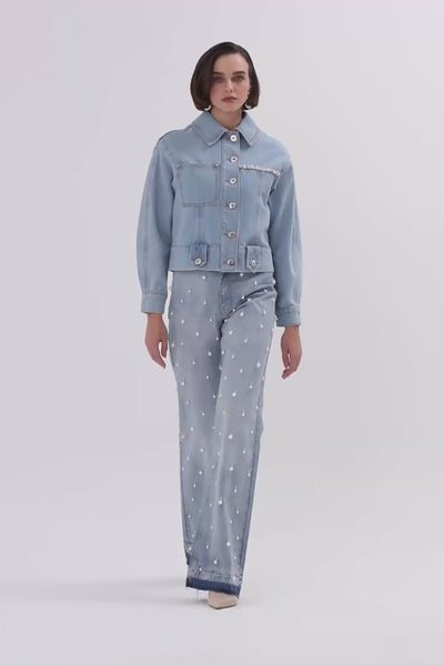 Pencere Detaylı Taşlı Jean Ceket