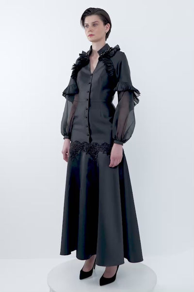 Pile Detaylı Yakası İşlemeli V Yaka Kloş Uzun Elbise