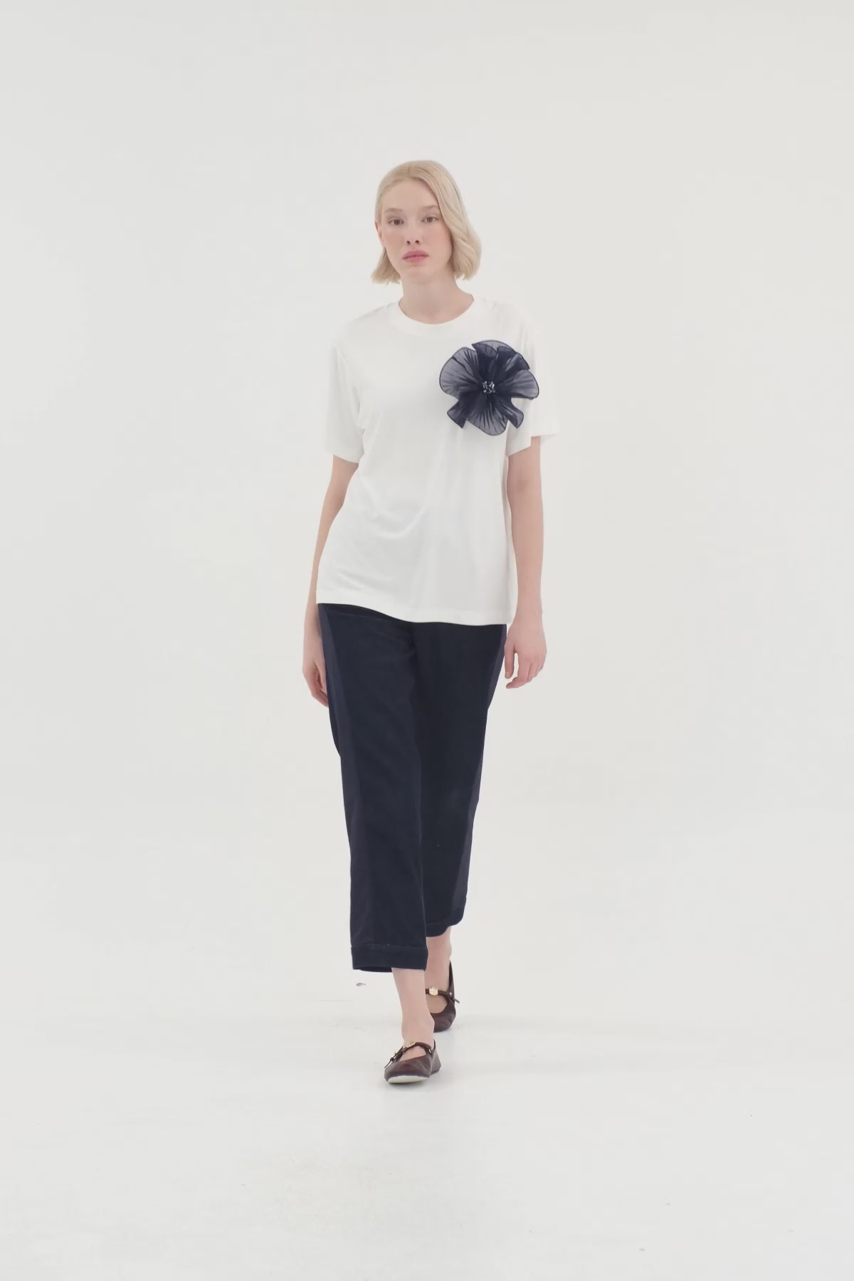 Plise Ve İşlemeli Çiçek Aksesuarlı Ekru T-Shirt