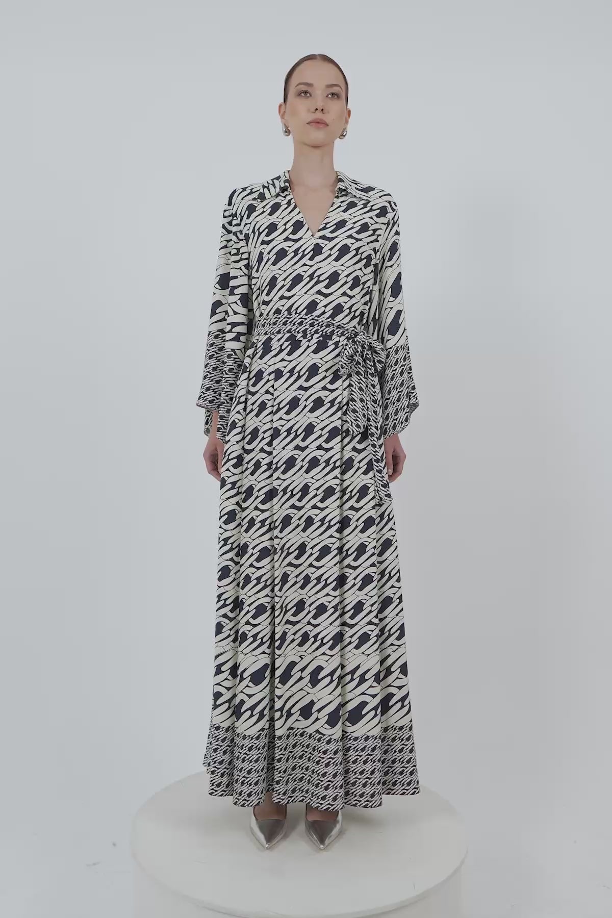 Seyyar Kuşak Detaylı Desenli Uzun Elbise
