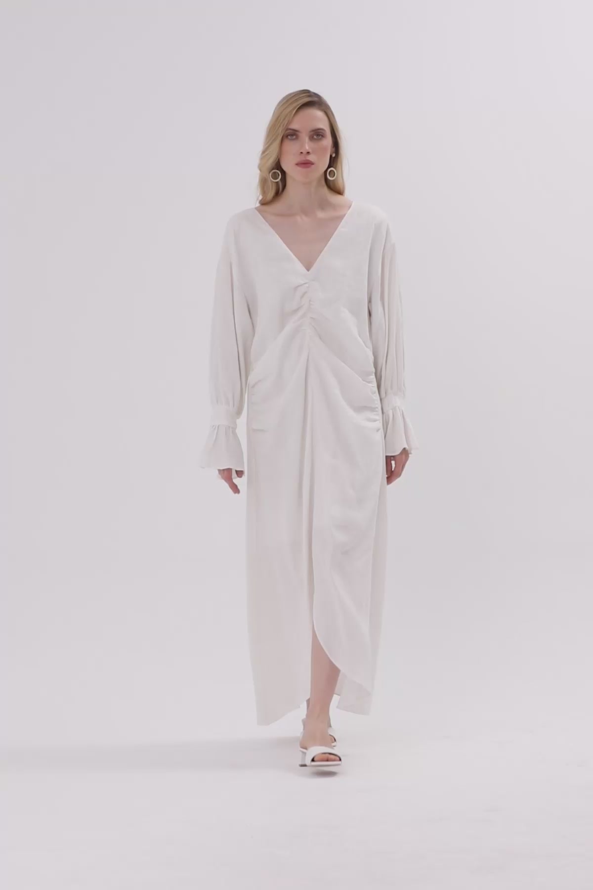 Sırt Dekolteli Önü Büzgülü Uzun Elbise