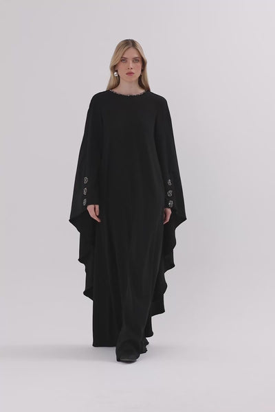 Taş İşlemeli Pelerin Detaylı Uzun Siyah Elbise