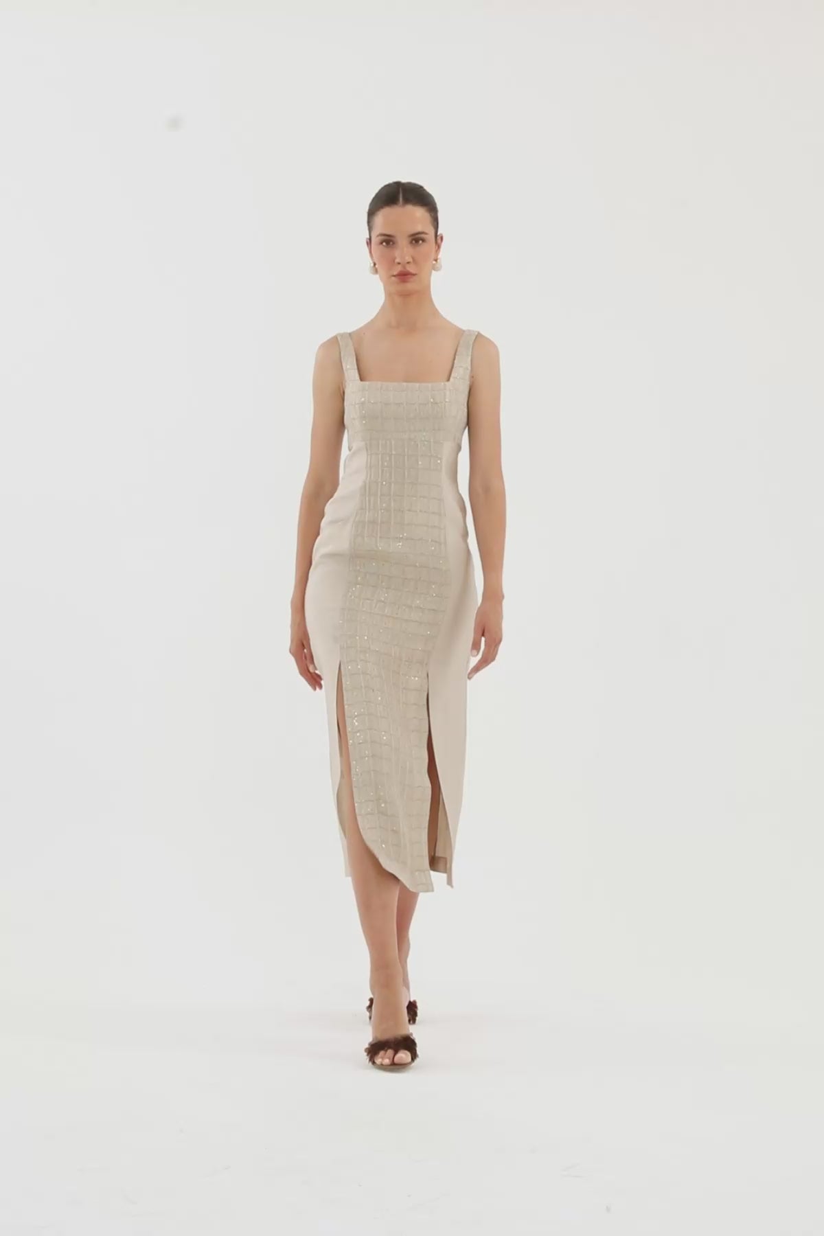 Torba Cepli Kare Yaka Bej Maxi Elbise