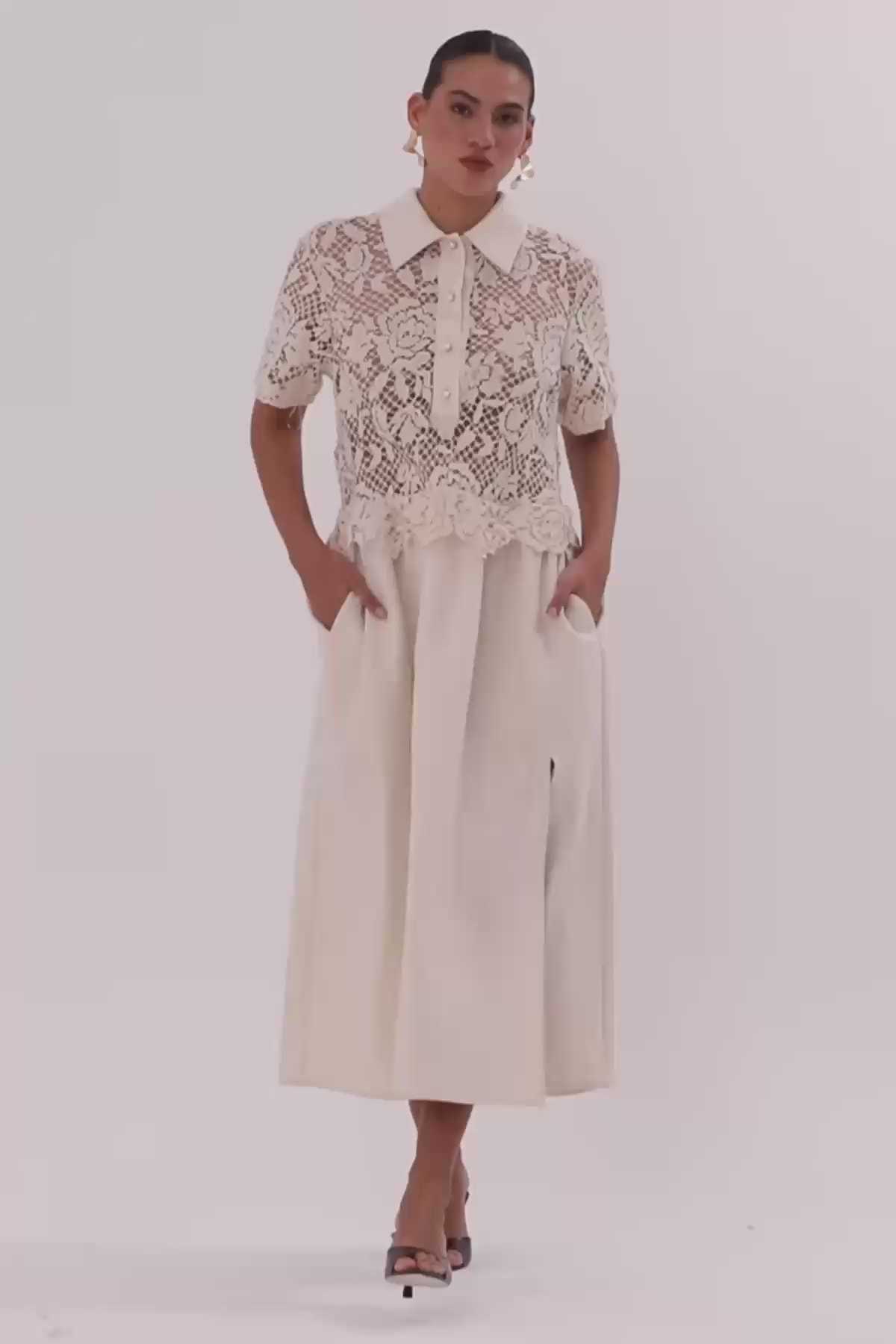 Üstü Dantelli Kısa Kollu Kemik Midi Elbise