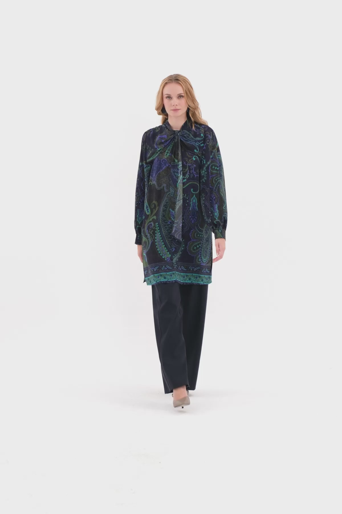 Yakadan Bağlamalı Uzun Kollu Desenli Bluz