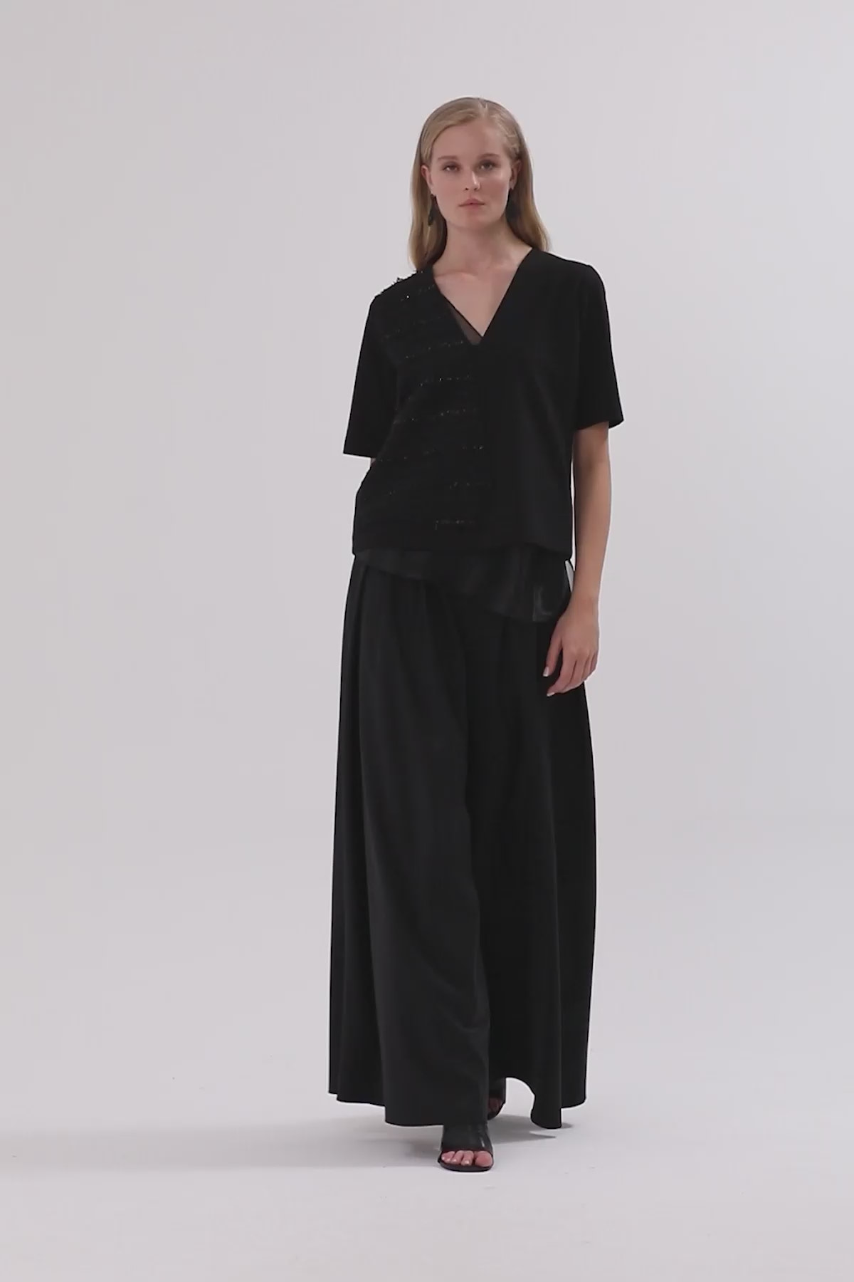 V Yakalı Organze Parçalı Kısa Kollu Bluz