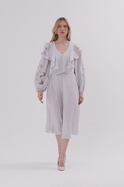Volan Detaylı Nakışlı Uzun Elbise