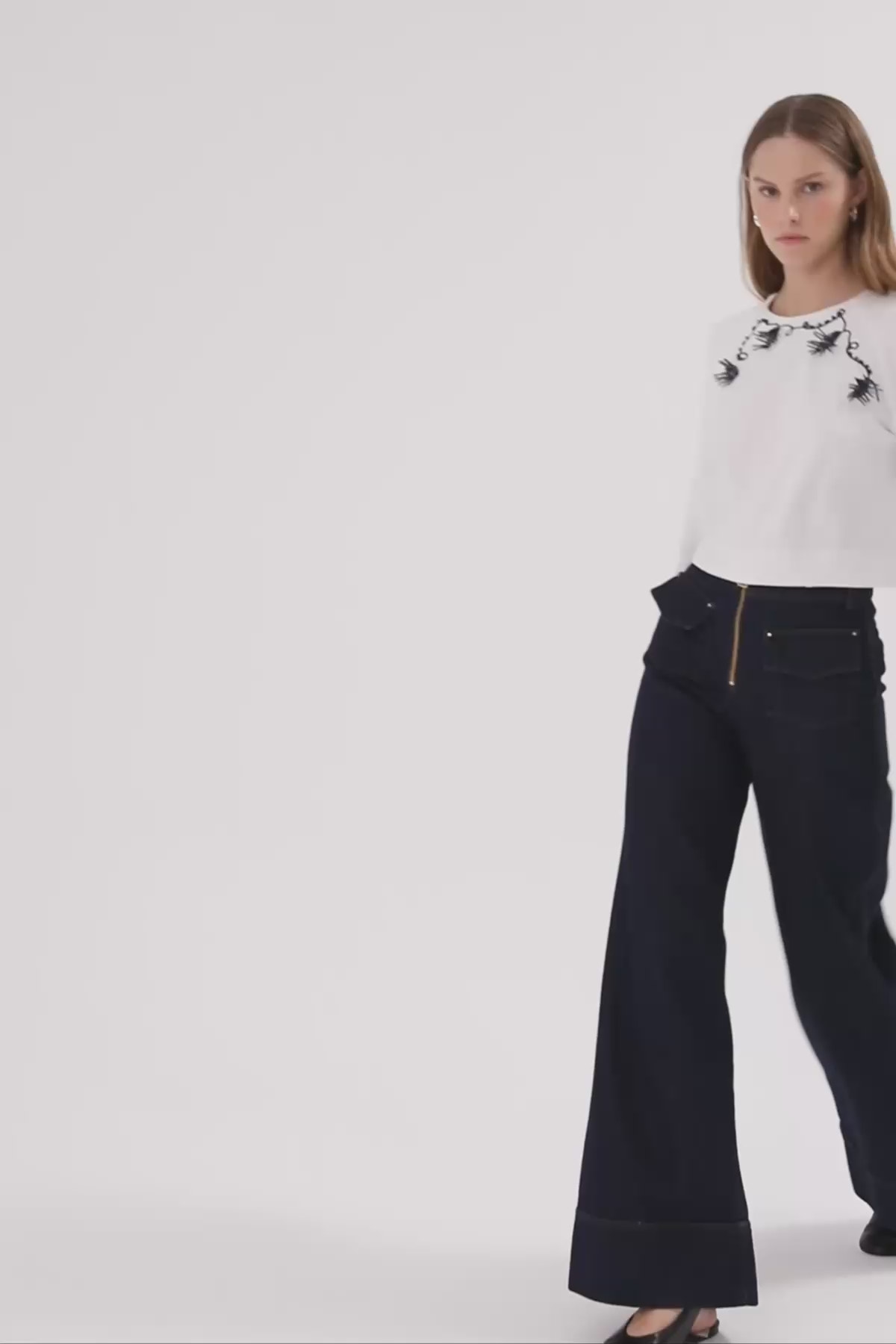 Yaka Ve Koları Nakışlı Boncuk İşlemeli Uzun Kollu T-Shirt