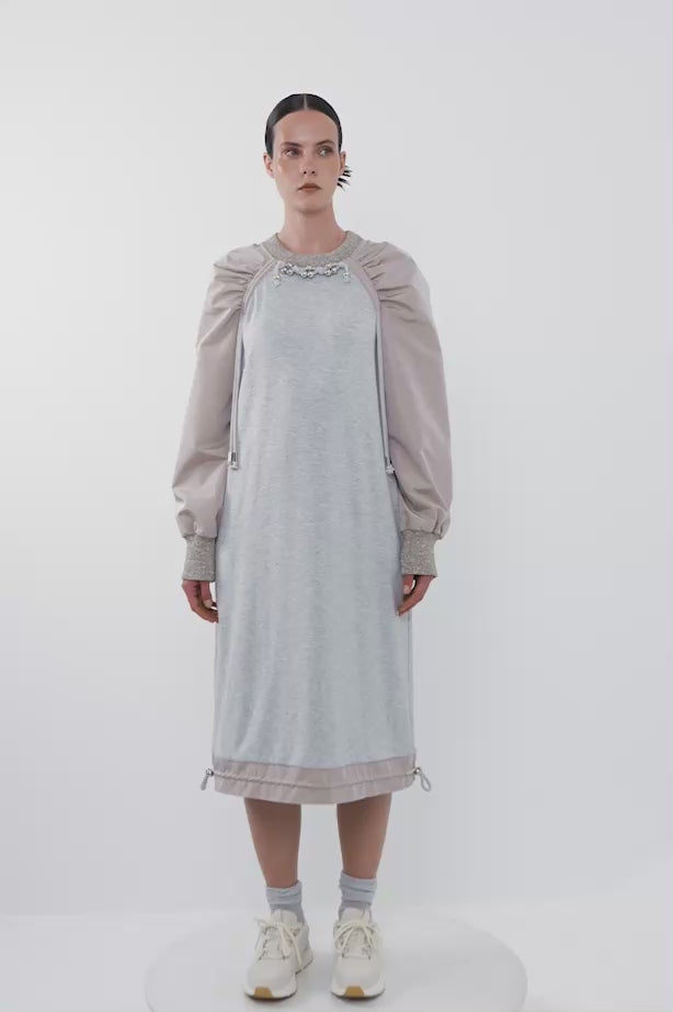Yakası Boncuklu Kordon Detaylı Eteği Büzülebilir Tafta Kollu Uzun Elbise