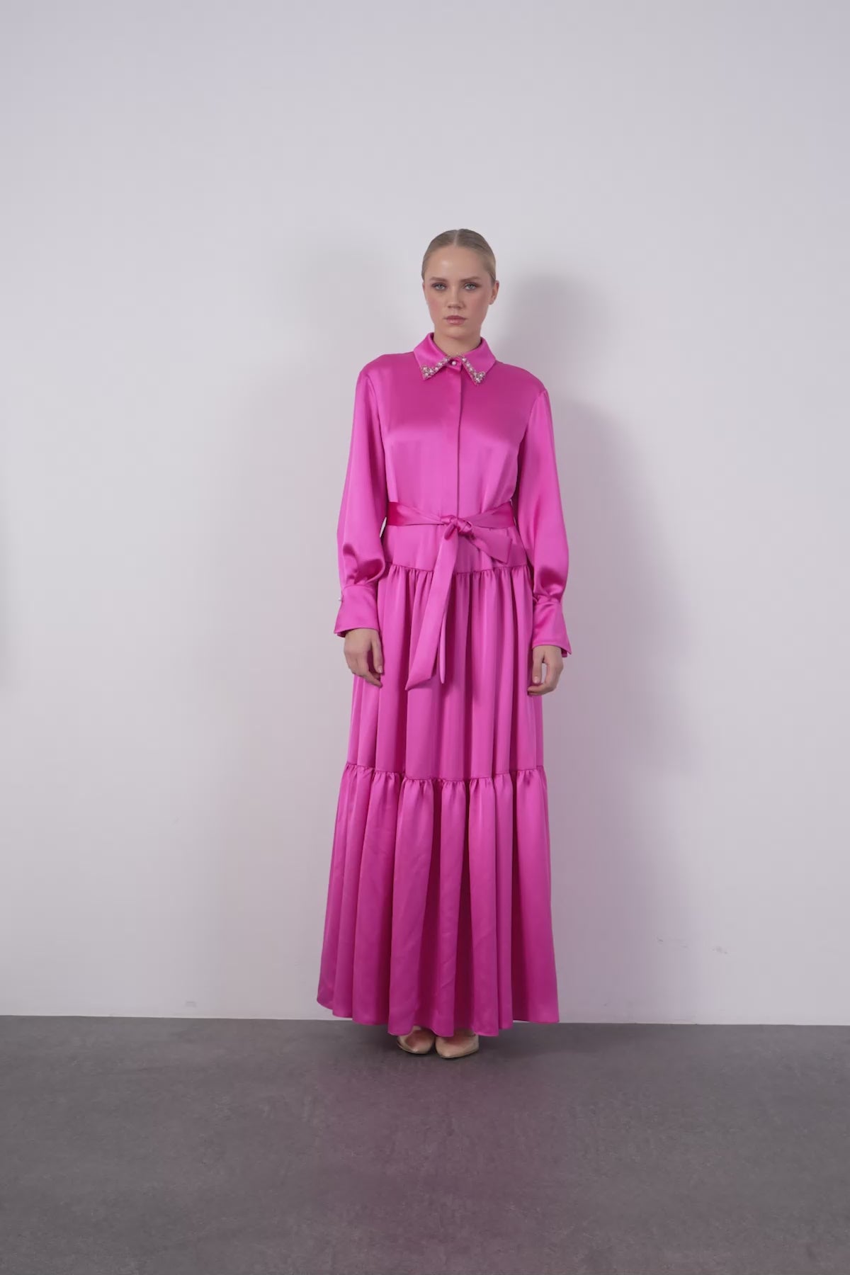 Yakası İşlemeli Kuşaklı Saten Abiye Elbise