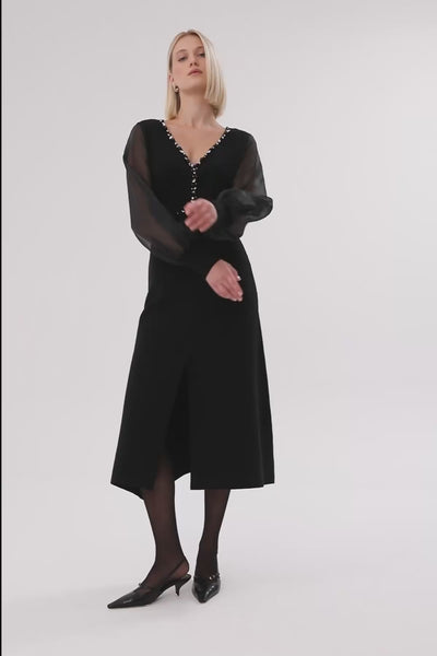 Yakası İşlemeli Önden Yırtmaçlı Midi Boy Elbise