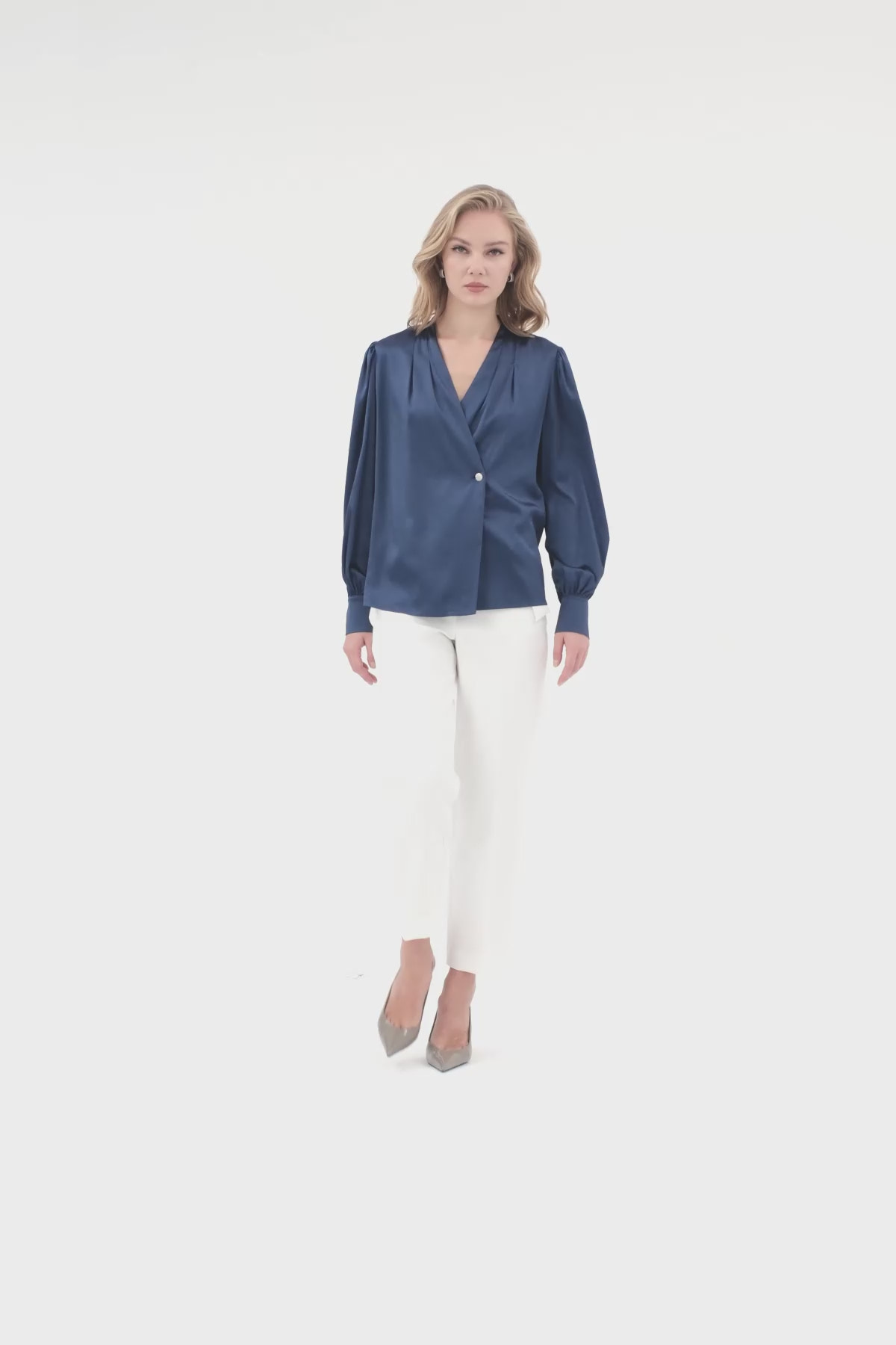 Yakası Pileli Kolları Ve Önü Düğmeli Kadın Bluz