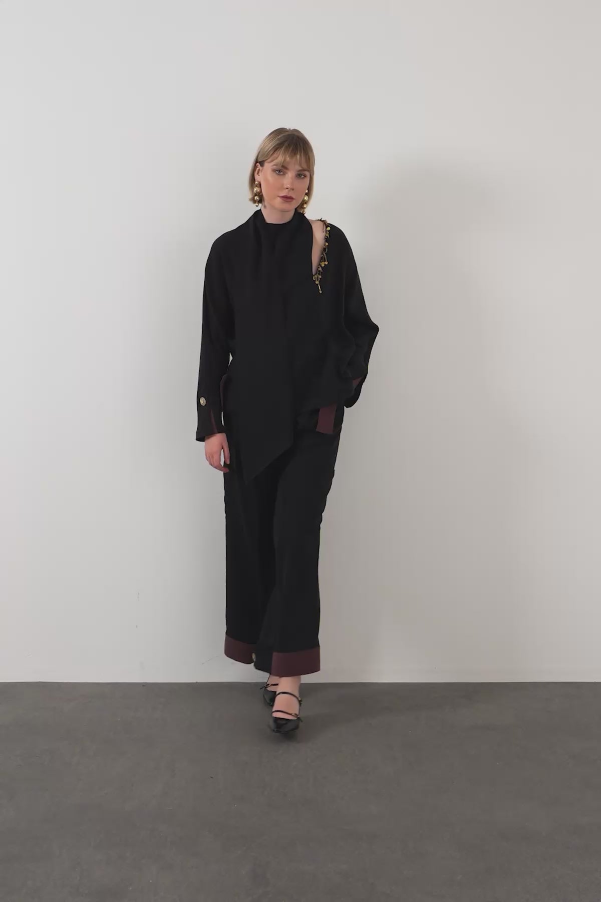 Yakasından Kuşak Detaylı İşlemeli Astarsız Uzun Kollu Bluz