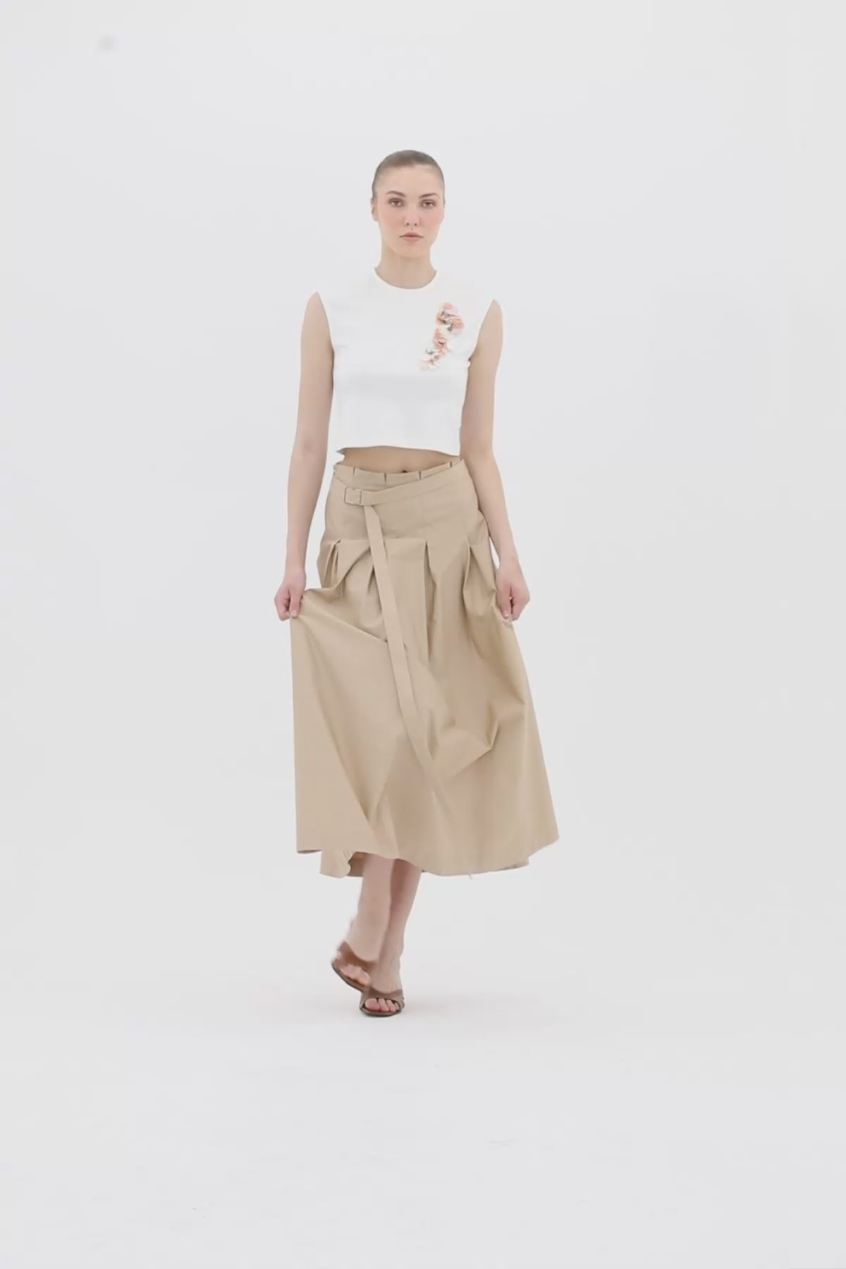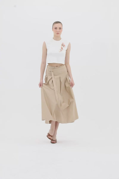 Yandan Fermuarlı Pili Katlamalı Bej Etek