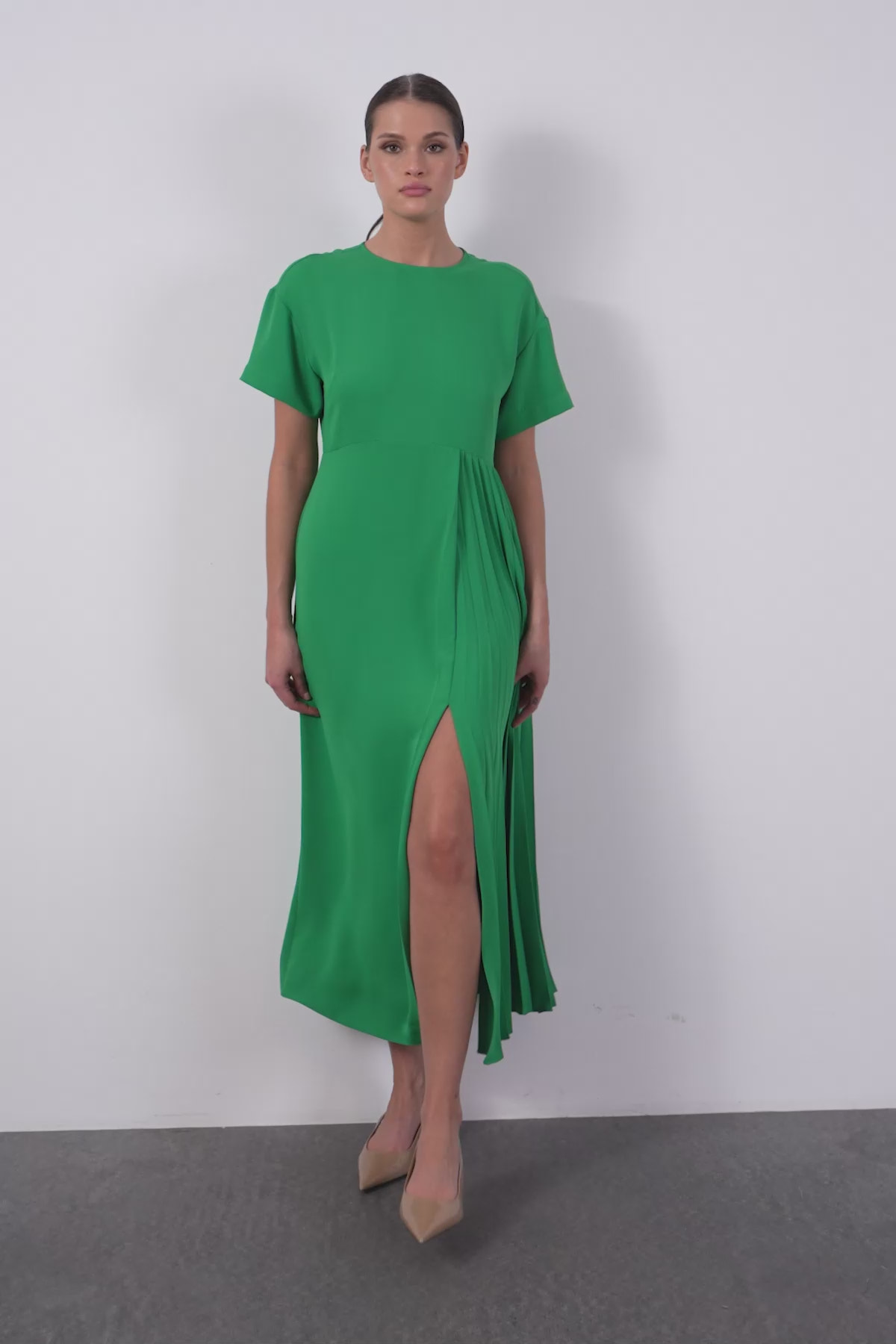 Yandan Piliseli Arkadan Bağlama Detaylı Yırtmaçlı Maxi Elbise