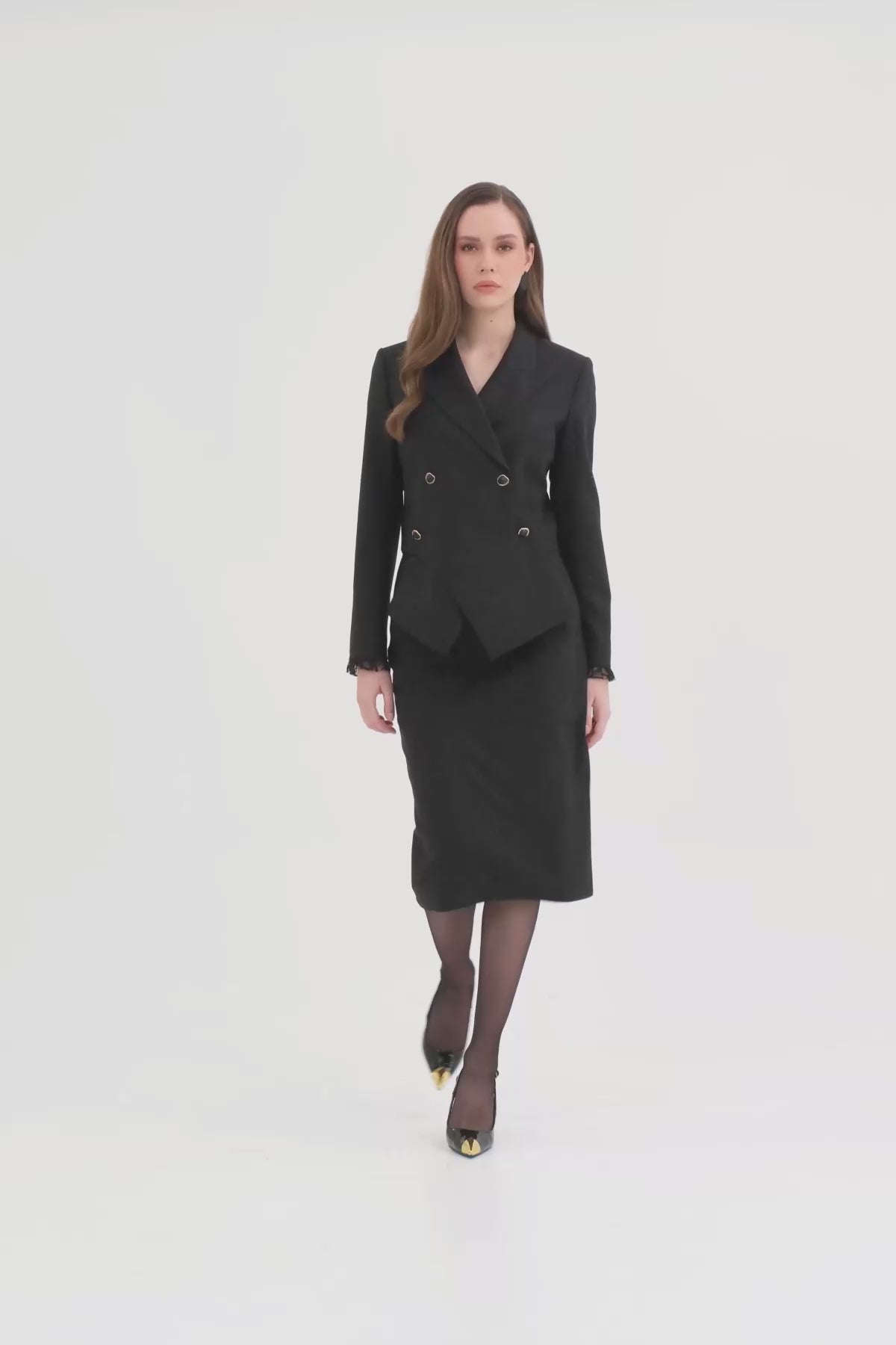 Yün Karışımlı Vatkalı Dantelli Asimetrik Siyah Ceket