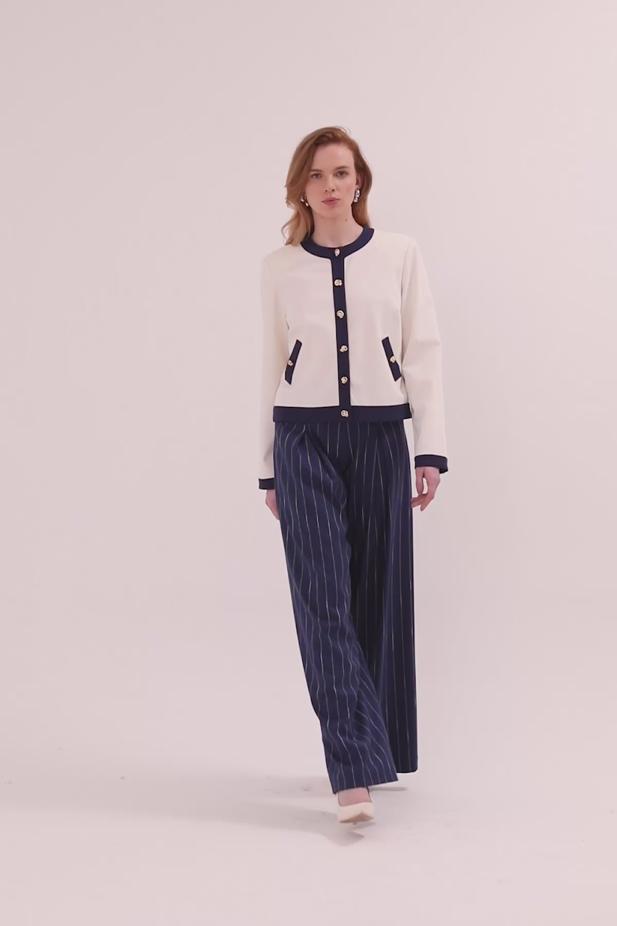 Yuvarlak Yaka Ceket Ve Pileli Pantolonlu Takım