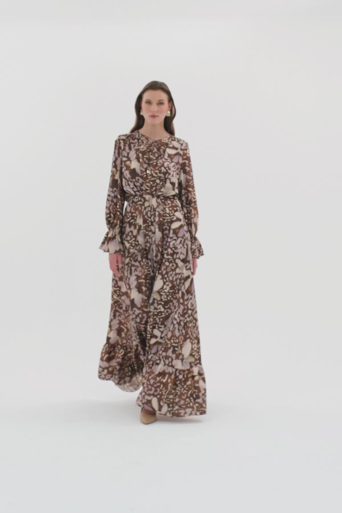 Yuvarlak Yaka Önden Kordonlu Volanlı Uzun Elbise