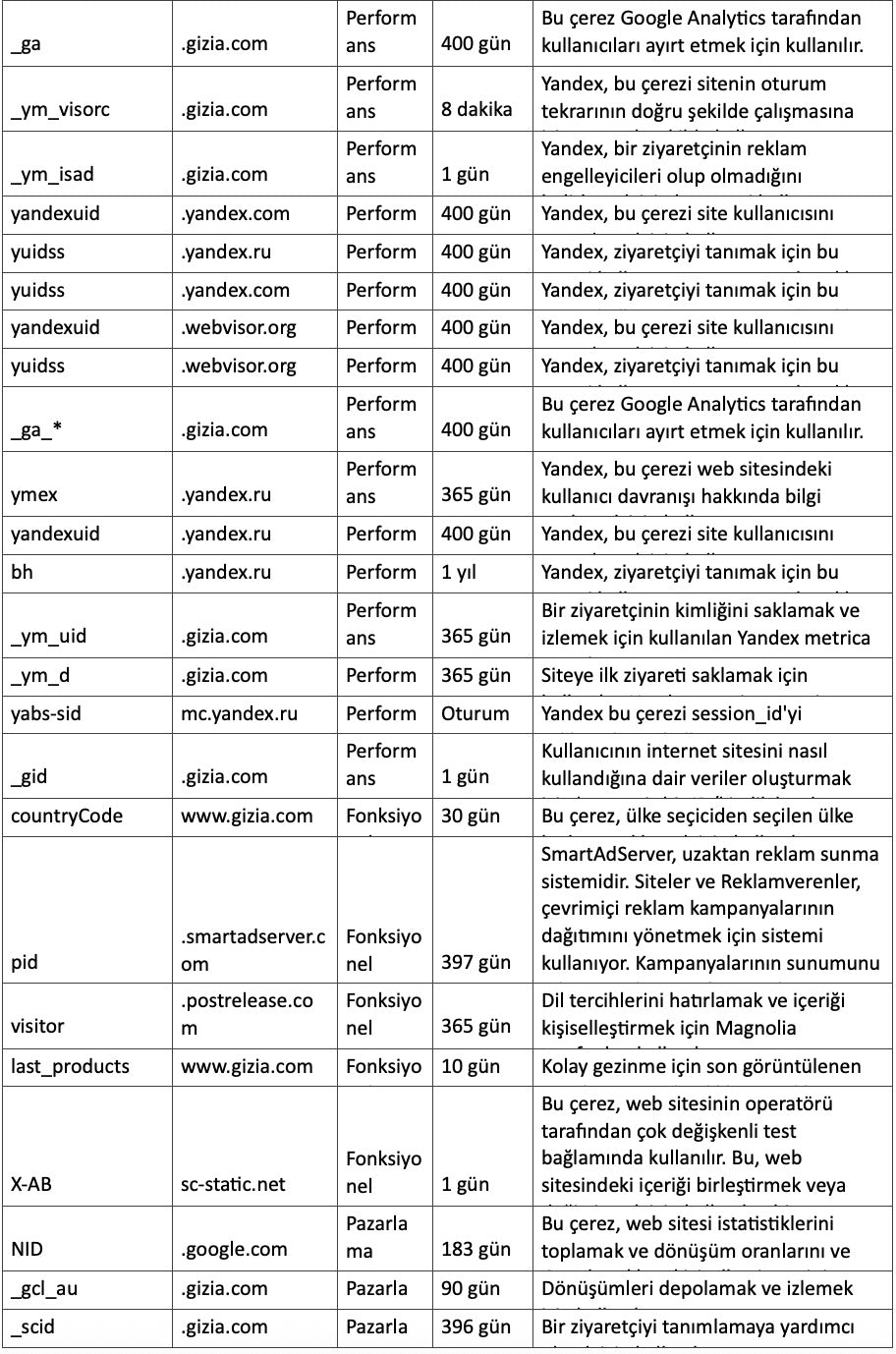 İnternet sitemizde yer alan çerezlere ilişkin bilgiler aşağıdaki tabloda yer almaktadır.